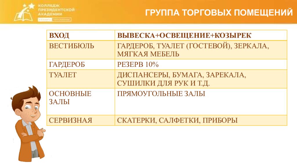 ГРУППА ТОРГОВЫХ ПОМЕЩЕНИЙ ВХОД ВЫВЕСКА+ОСВЕЩЕНИЕ+КОЗЫРЕК ВЕСТИБЮЛЬ ГАРДЕРОБ, ТУАЛЕТ (ГОСТЕВОЙ), ЗЕРКАЛА, МЯГКАЯ МЕБЕЛЬ ГАРДЕРОБ РЕЗЕРВ 10% ТУАЛЕТ ДИСПАНСЕРЫ, БУМАГА, ЗАРЕКАЛА, СУШИЛКИ ДЛЯ РУК И Т.Д. ОСНОВНЫЕ ЗАЛЫ ПРЯМОУГОЛЬНЫЕ ЗАЛЫ СЕРВИЗНАЯ СКАТЕРКИ, САЛФЕТКИ, ПРИБОРЫ