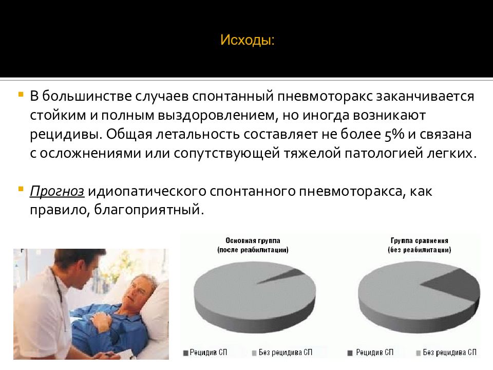 В большинстве случаев спонтанный пневмоторакс заканчивается стойким и полным выздоровлением, но иногда возникают рецидивы. Общая летальность составляет не более 5% и связана с осложнениями или сопутствующей тяжелой патологией легких. Прогноз идиопатического спонтанного пневмоторакса, как правило, благоприятный.