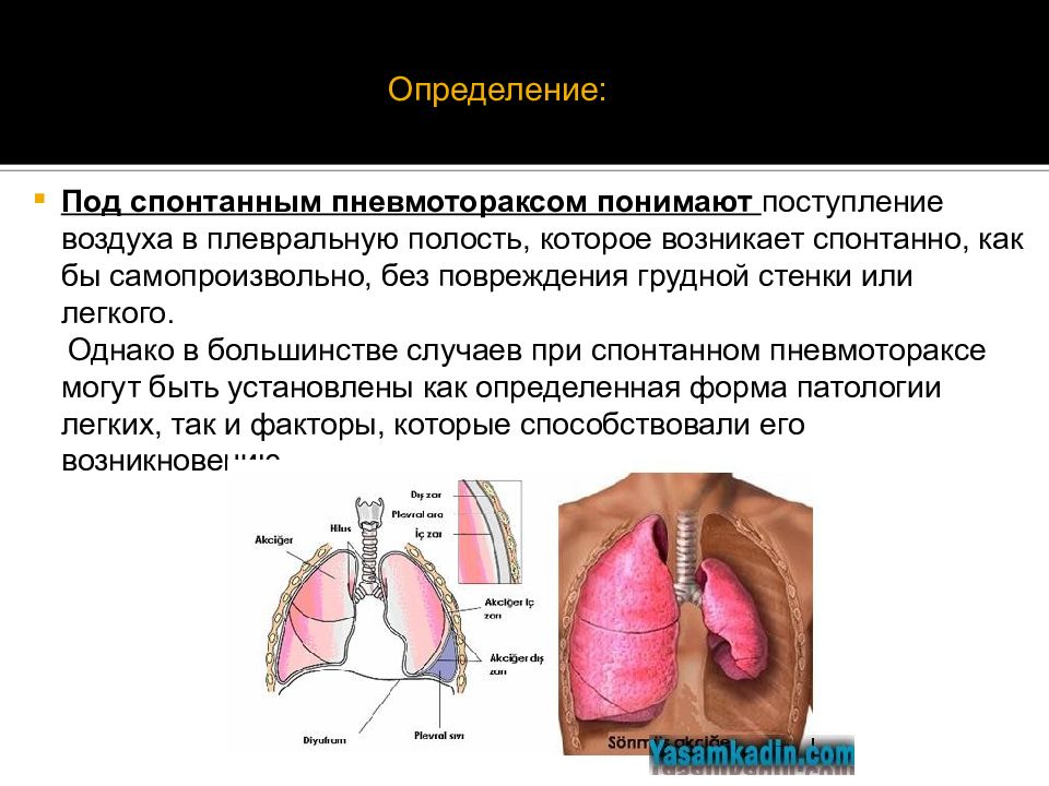 Под спонтанным пневмотораксом понимают поступление воздуха в плевральную полость, которое возникает спонтанно, как бы самопроизвольно, без повреждения грудной стенки или легкого. Однако в большинстве случаев при спонтанном пневмотораксе могут быть установлены как определенная форма патологии легких, так и факторы, которые способствовали его возникновению.