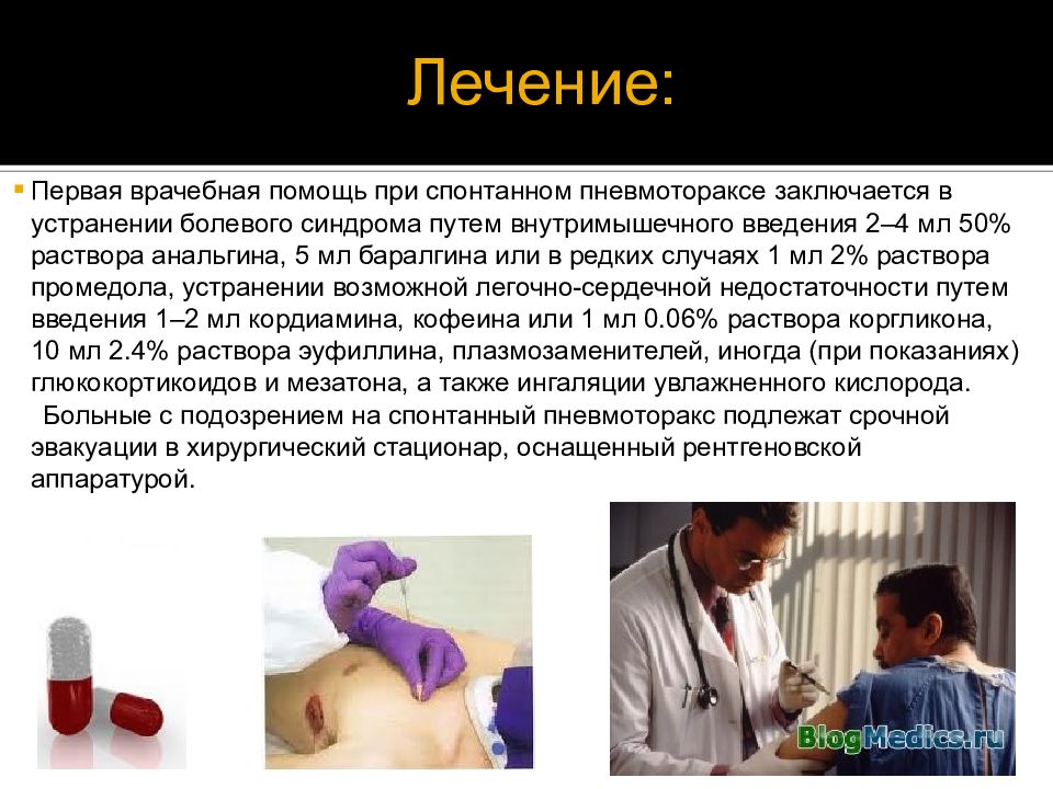 Первая врачебная помощь при спонтанном пневмотораксе заключается в устранении болевого синдрома путем внутримышечного введения 2–4 мл 50% раствора анальгина, 5 мл баралгина или в редких случаях 1 мл 2% раствора промедола, устранении возможной легочно-сердечной недостаточности путем введения 1–2 мл кордиамина, кофеина или 1 мл 0.06% раствора коргликона, 10 мл 2.4% раствора эуфиллина, плазмозаменителей, иногда (при показаниях) глюкокортикоидов и мезатона, а также ингаляции увлажненного кислорода. Больные с подозрением на спонтанный пневмоторакс подлежат срочной эвакуации в хирургический стационар, оснащенный рентгеновской аппаратурой.