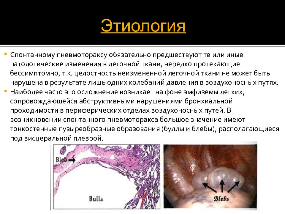 Спонтанному пневмотораксу обязательно предшествуют те или иные патологические изменения в легочной ткани, нередко протекающие бессимптомно, т.к. целостность неизмененной легочной ткани не может быть нарушена в результате лишь одних колебаний давления в воздухоносных путях. Наиболее часто это осложнение возникает на фоне эмфиземы легких, сопровождающейся абструктивными нарушениями бронхиальной проходимости в периферических отделах воздухоносных путей. В возникновении спонтанного пневмоторакса большое значение имеют тонкостенные пузыреобразные образования (буллы и блебы ), располагающиеся под висцеральной плеврой.