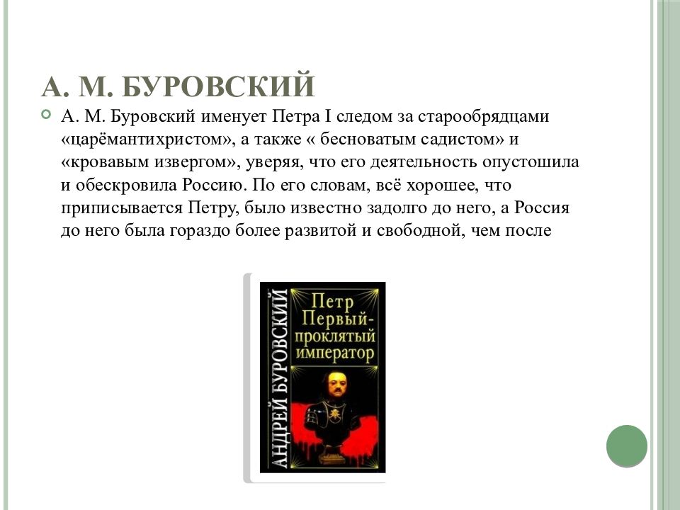 А. М. Буровский именует Петра I следом за старообрядцами « царёмантихристом », а также « бесноватым садистом» и «кровавым извергом», уверяя, что его деятельность опустошила и обескровила Россию. По его словам, всё хорошее, что приписывается Петру, было известно задолго до него, а Россия до него была гораздо более развитой и свободной, чем после