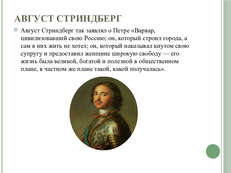 Август Cтриндберг так заявлял o Петре «Варвар, цивилизовавший свою Россию; он, который строил города, а сам в них жить не хотел; он, который наказывал кнутом свою супругу и предоставил женщине широкую свободу — его жизнь была великой, богатой и полезной в общественном плане, в частном же плане такой, какой получалась».