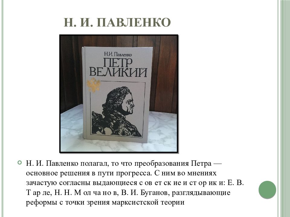Н. И. Павленко полагал, то что преобразования Петра — основное решения в пути прогресса. С ним во мнениях зачастую согласны выдающиеся с ов ет ск ие и ст ор ик и: Е. В. Т ар ле, Н. Н. М ол ча но в, В. И. Буганов, разглядывающие реформы с точки зрения марксистской теории