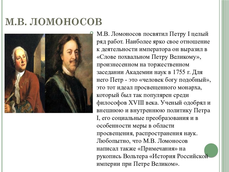 М.В. Ломоносов посвятил Петру I целый ряд работ. Наиболее ярко свое отношение к деятельности императора он выразил в «Слове похвальном Петру Великому», произнесенном на торжественном заседании Академии наук в 1755 г. Для него Петр - это «человек богу подобный», это тот идеал просвещенного монарха, который был так популярен среди философов XVIII века. Ученый одобрял и внешнюю и внутреннюю политику Петра I, его социальные преобразования и в особенности меры в области просвещения, распространения наук. Любопытно, что М.В. Ломоносов написал также «Примечания» на рукопись Вольтера «История Российской империи при Петре Великом».