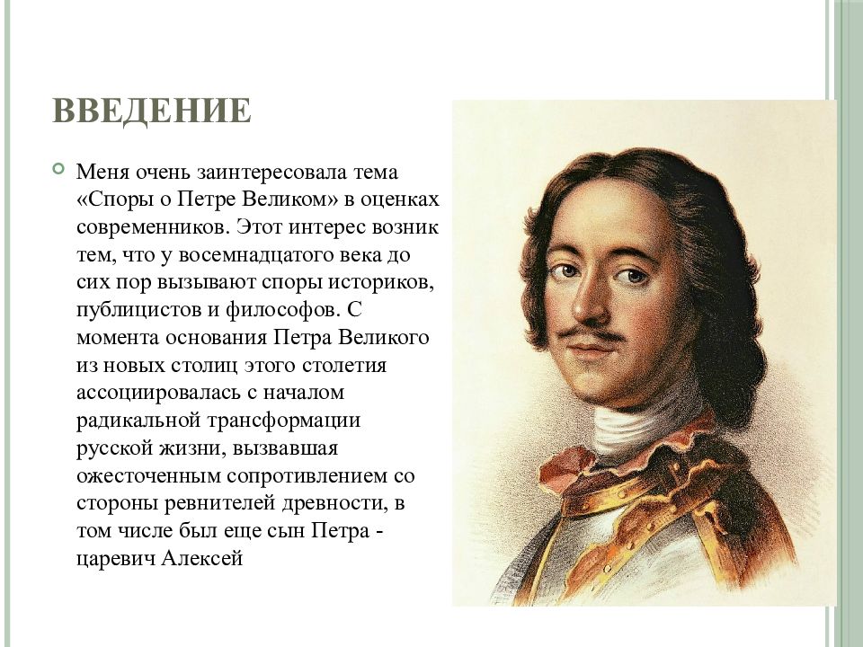 Меня очень заинтересовала тема «Споры о Петре Великом» в оценках современников. Этот интерес возник тем, что у восемнадцатого века до сих пор вызывают споры историков, публицистов и философов. С момента основания Петра Великого из новых столиц этого столетия ассоциировалась с началом радикальной трансформации русской жизни, вызвавшая ожесточенным сопротивлением со стороны ревнителей древности, в том числе был еще сын Петра - царевич Алексей