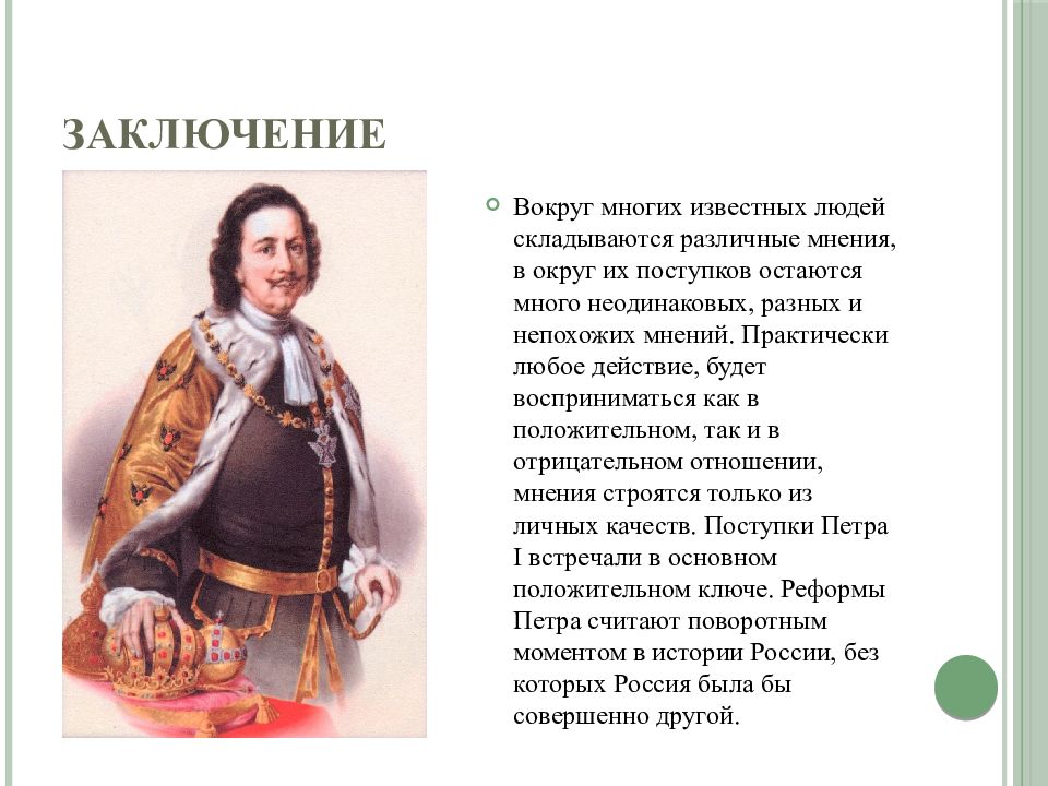 Вокруг многих известных людей складываются различные мнения, в округ их поступков остаются много неодинаковых, разных и непохожих мнений. Практически любое действие, будет восприниматься как в положительном, так и в отрицательном отношении, мнения строятся только из личных качеств. Поступки Петра I встречали в основном положительном ключе. Реформы Петра считают поворотным моментом в истории России, без которых Россия была бы совершенно другой.