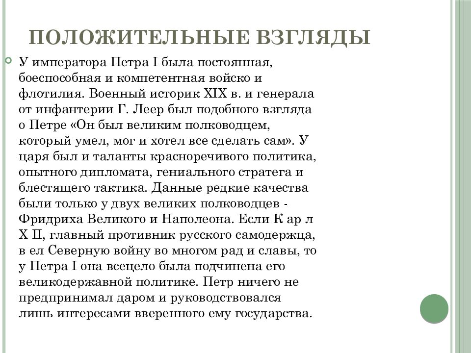 У императора Петра I была постоянная, боеспособная и компетентная войско и флотилия. Военный историк XIX в. и генерала от инфантерии Г. Леер был подобного взгляда o Петре «Он был великим полководцем, который умел, мог и хотел все сделать сам». У царя был и таланты красноречивого политика, опытного дипломата, гениального стратега и блестящего тактика. Данные редкие качества были только у двух великих полководцев - Фридриха Вeликого и Наполеона. Если К ар л X II, главный противник русского самодержца, в ел Северную войну во многом рад и славы, то у Петра I она всецело была подчинена его великодержавной политике. Петр ничего не предпринимал даром и руководствовался лишь интересами вверенного ему государства.
