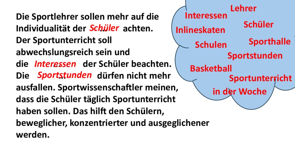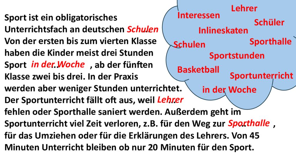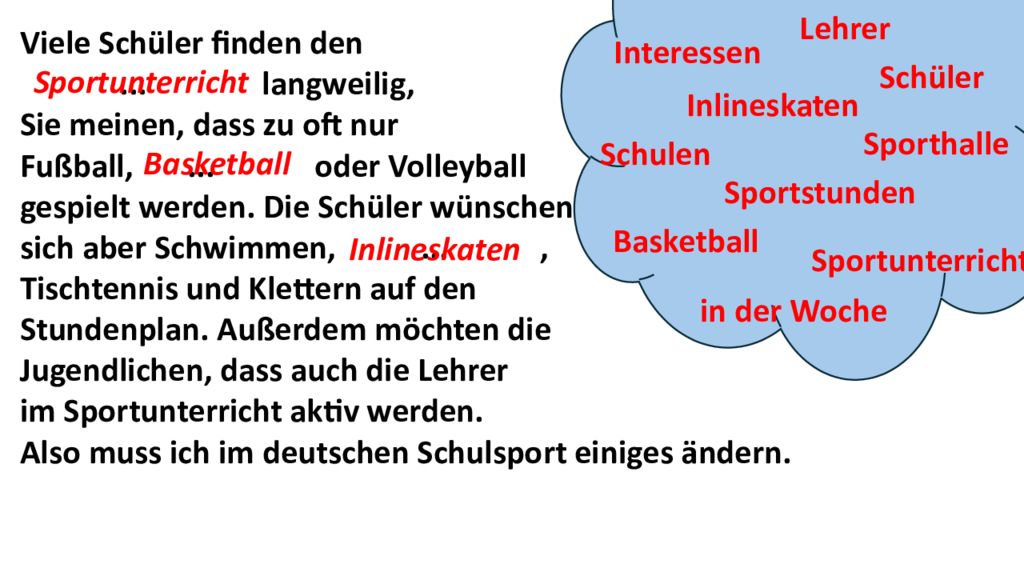 Viele Schüler finden den ... langweilig, Sie meinen, dass zu oft nur Fußball,... oder Volleyball gespielt werden. Die Schüler wünschen sich aber Schwimmen,..., Tischtennis und Klettern auf den Stundenplan. Außerdem möchten die Jugendlichen, dass auch die Lehrer im Sportunterricht aktiv werden. Also muss ich im deutschen Schulsport einiges ändern. Interessen Lehrer Schüler Inlineskaten Schulen Sporthalle Sportstunden Basketball Sportunterricht in der Woche Sportunterricht Basketball Inlineskaten
