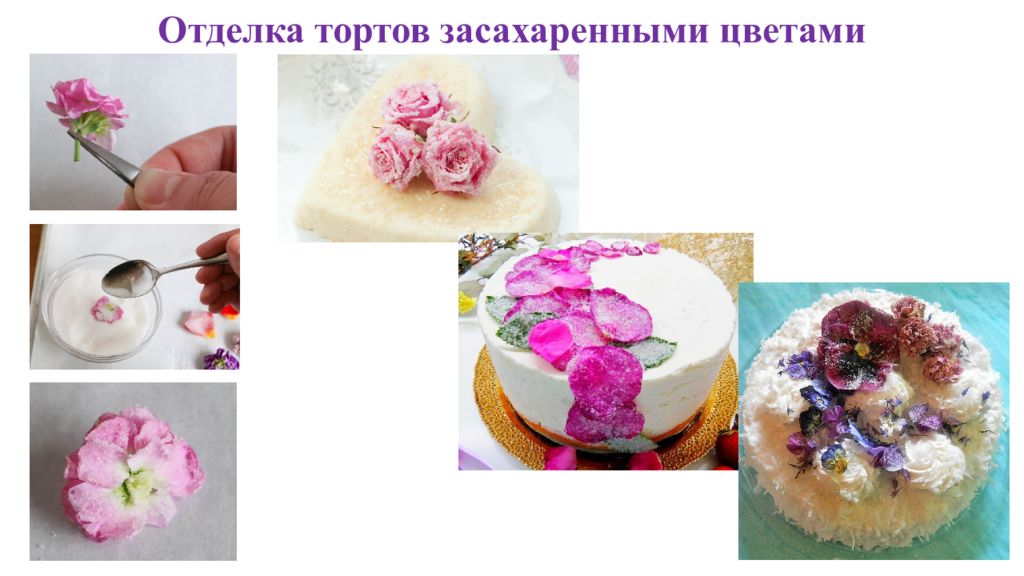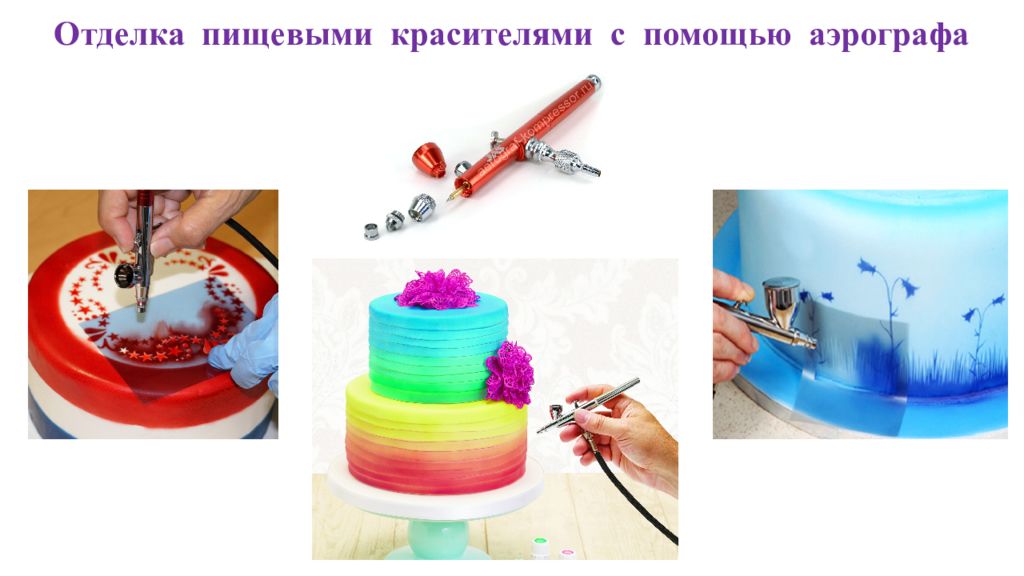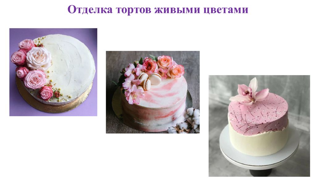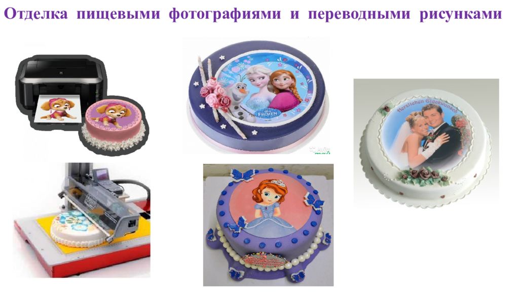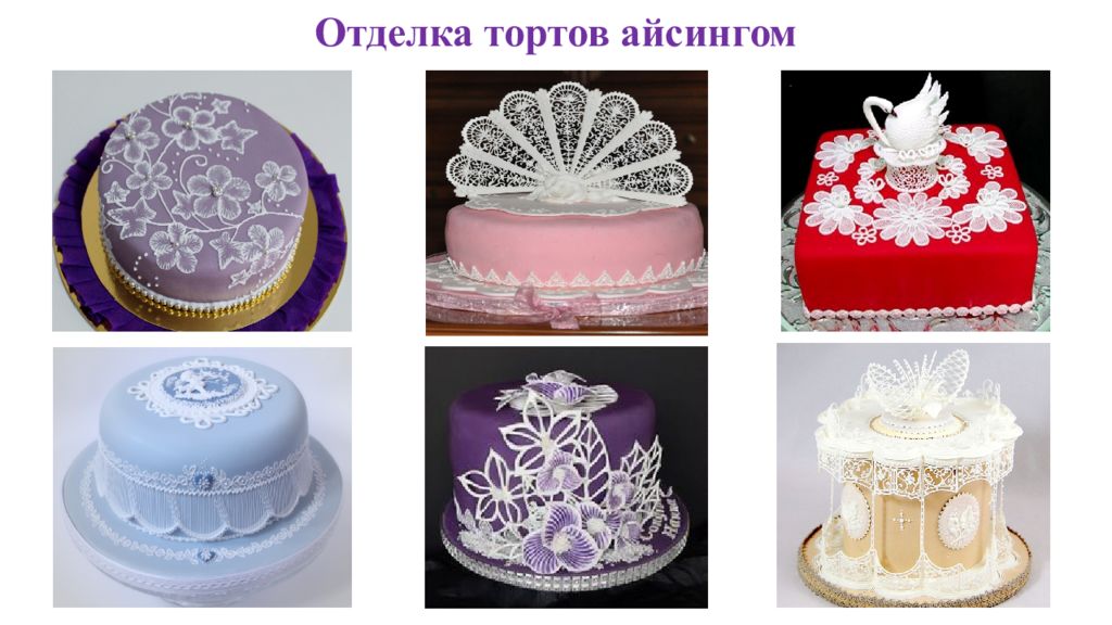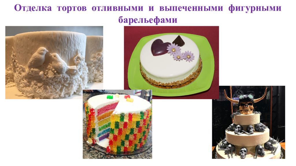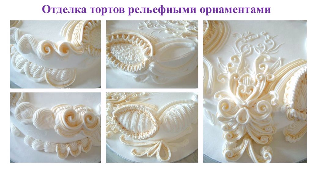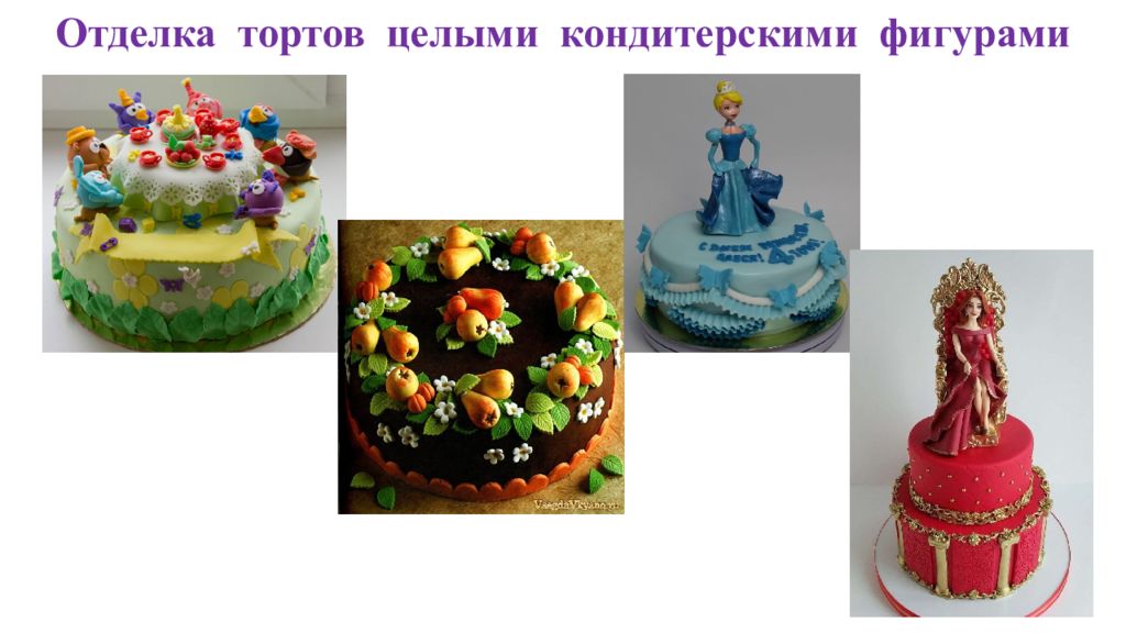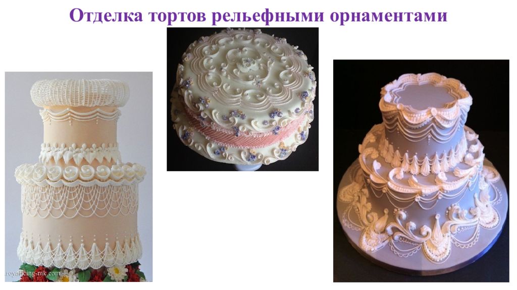 Отделка праздничного торта - сочетание выпеченных полуфабрикатов, представляющих собой основу торта, с различными отделочными полуфабрикатами. Виды отделки 1) контурно-рельефная отделка кремом и глазурью; 2) отделка отливными и выпеченными фигурными барельефами; 3) отделка целыми фигурами, цветами, орнаментами и другими украшениями из разных полуфабрикатов; 4) обтяжка тортов сахарной мастикой; 5) отделка пищевыми фотографиями и переводными рисунками; 6) отделка пищевыми красителями с помощью аэрографа