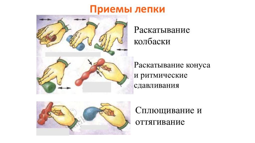 Приемы лепки Раскатывание колбаски Раскатывание конуса и ритмические сдавливания Сплющивание и оттягивание