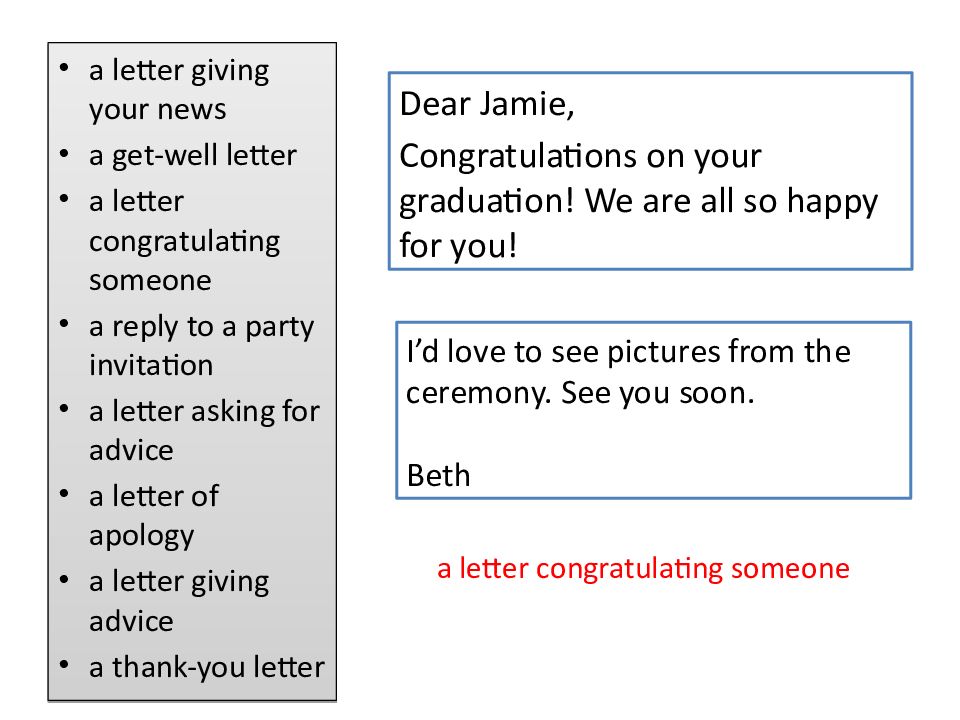a letter giving your news a get-well letter a letter congratulating someone a reply to a party invitation a letter asking for advice a letter of apology a letter giving advice a thank-you letter Dear Jamie, Congratulations on your graduation! We are all so happy for you! I’d love to see pictures from the ceremony. See you soon. Beth a letter congratulating someone
