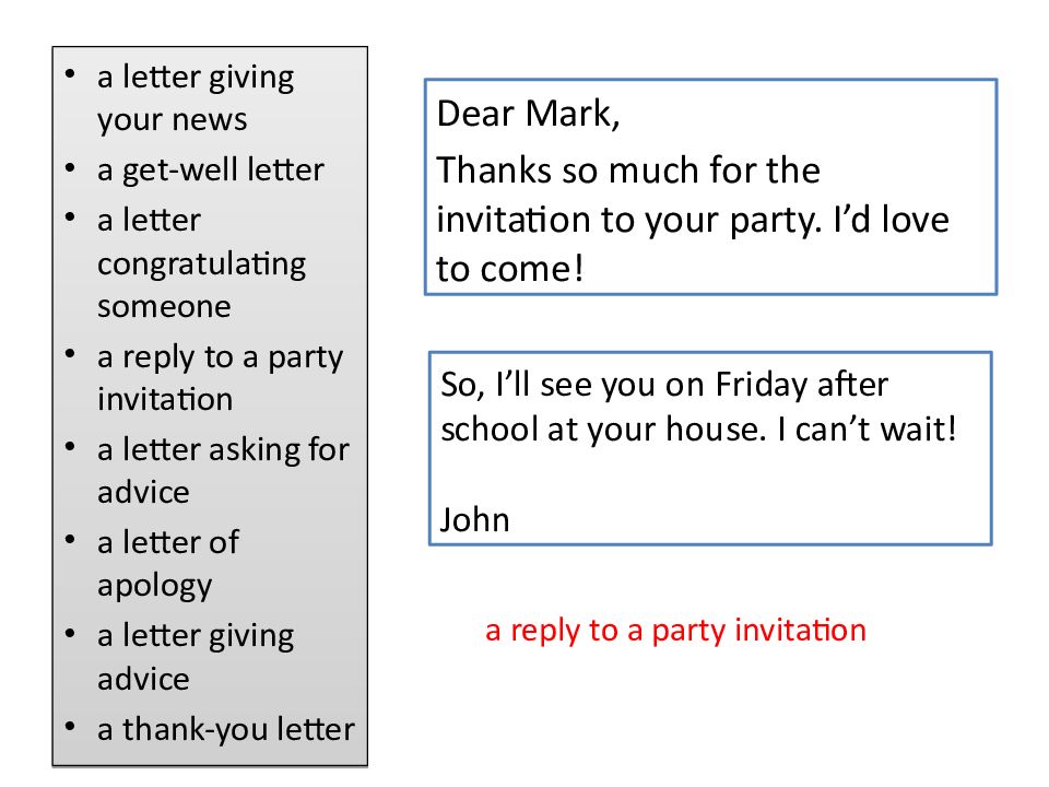 a letter giving your news a get-well letter a letter congratulating someone a reply to a party invitation a letter asking for advice a letter of apology a letter giving advice a thank-you letter Dear Mark, Thanks so much for the invitation to your party. I’d love to come! So, I’ll see you on Friday after school at your house. I can’t wait! John a reply to a party invitation