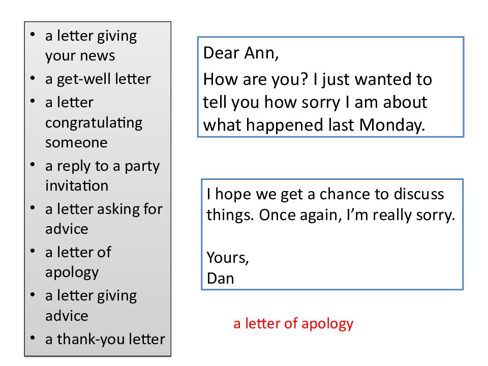 a letter giving your news a get-well letter a letter congratulating someone a reply to a party invitation a letter asking for advice a letter of apology a letter giving advice a thank-you letter Dear Ann, How are you? I just wanted to tell you how sorry I am about what happened last Monday. I hope we get a chance to discuss things. Once again, I’m really sorry. Yours, Dan a letter of apology