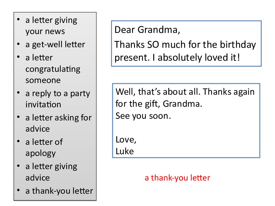 a letter giving your news a get-well letter a letter congratulating someone a reply to a party invitation a letter asking for advice a letter of apology a letter giving advice a thank-you letter Dear Grandma, Thanks SO much for the birthday present. I absolutely loved it! Well, that’s about all. Thanks again for the gift, Grandma. See you soon. Love, Luke a thank-you letter