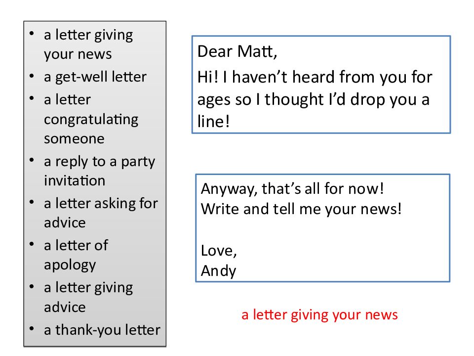 a letter giving your news a get-well letter a letter congratulating someone a reply to a party invitation a letter asking for advice a letter of apology a letter giving advice a thank-you letter Dear Matt, Hi! I haven’t heard from you for ages so I thought I’d drop you a line! Anyway, that’s all for now! Write and tell me your news! Love, Andy a letter giving your news