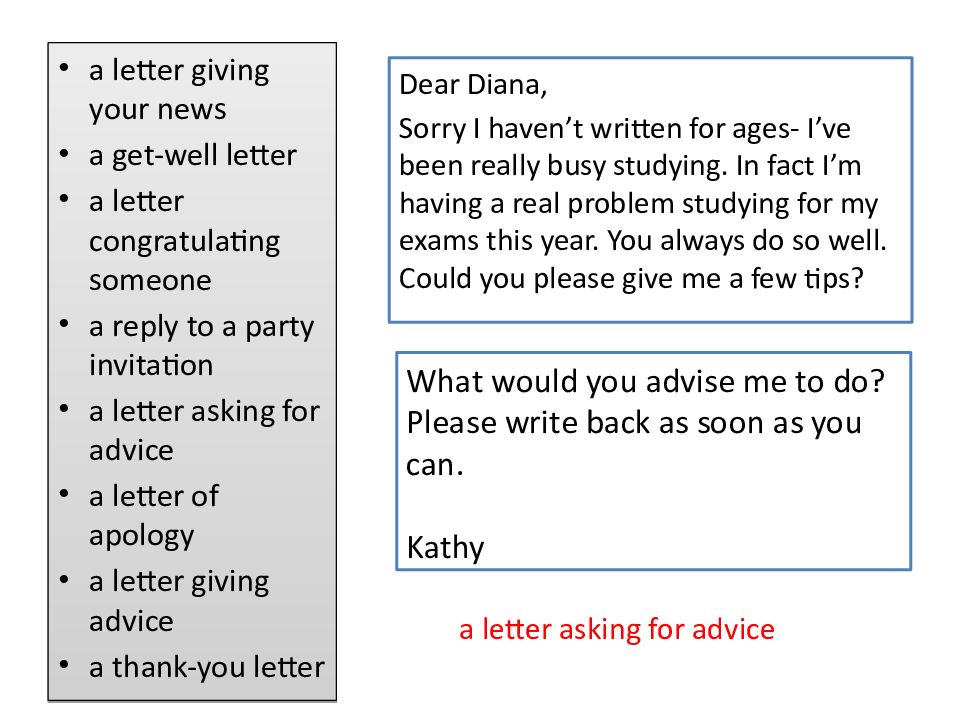 a letter giving your news a get-well letter a letter congratulating someone a reply to a party invitation a letter asking for advice a letter of apology a letter giving advice a thank-you letter Dear Diana, Sorry I haven’t written for ages- I’ve been really busy studying. In fact I’m having a real problem studying for my exams this year. You always do so well. Could you please give me a few tips? What would you advise me to do? Please write back as soon as you can. Kathy a letter asking for advice