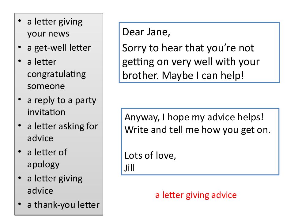 a letter giving your news a get-well letter a letter congratulating someone a reply to a party invitation a letter asking for advice a letter of apology a letter giving advice a thank-you letter Dear Jane, Sorry to hear that you’re not getting on very well with your brother. Maybe I can help! Anyway, I hope my advice helps! Write and tell me how you get on. Lots of love, Jill a letter giving advice