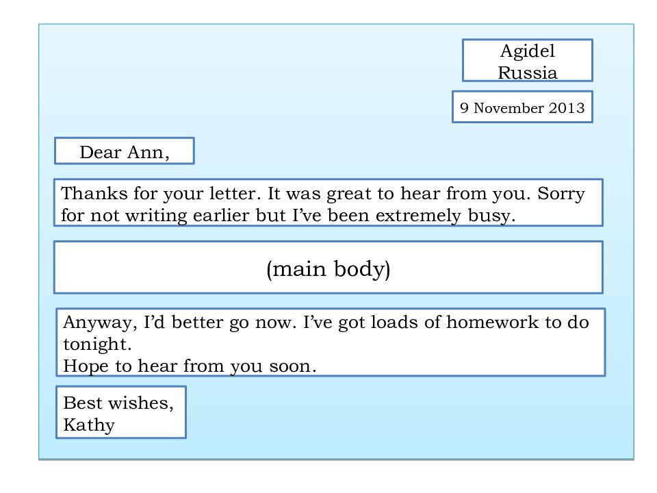 Agidel Russia 9 November 2013 Dear Ann, Thanks for your letter. It was great to hear from you. Sorry for not writing earlier but I’ve been extremely busy. (main body) Anyway, I’d better go now. I’ve got loads of homework to do tonight. Hope to hear from you soon. Best wishes, Kathy