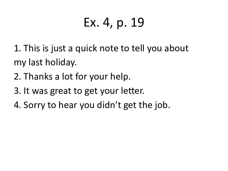 1. This is just a quick note to tell you about my last holiday. 2. Thanks a lot for your help. 3. It was great to get your letter. 4. Sorry to hear you didn’t get the job.