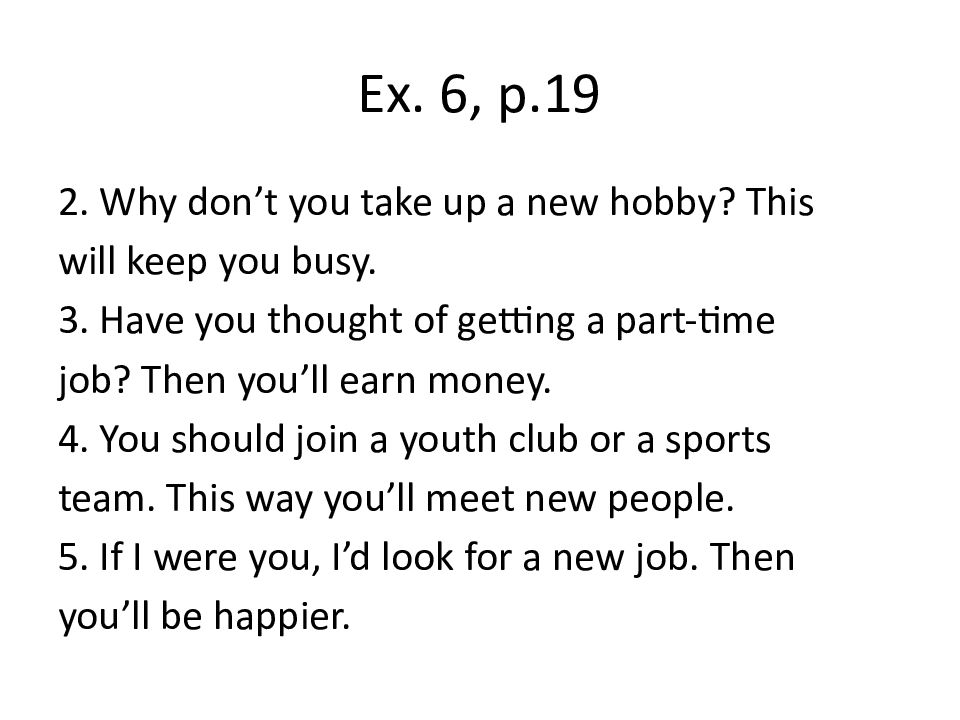 2. Why don’t you take up a new hobby? This will keep you busy. 3. Have you thought of getting a part-time job? Then you’ll earn money. 4. You should join a youth club or a sports team. This way you’ll meet new people. 5. If I were you, I’d look for a new job. Then you’ll be happier.