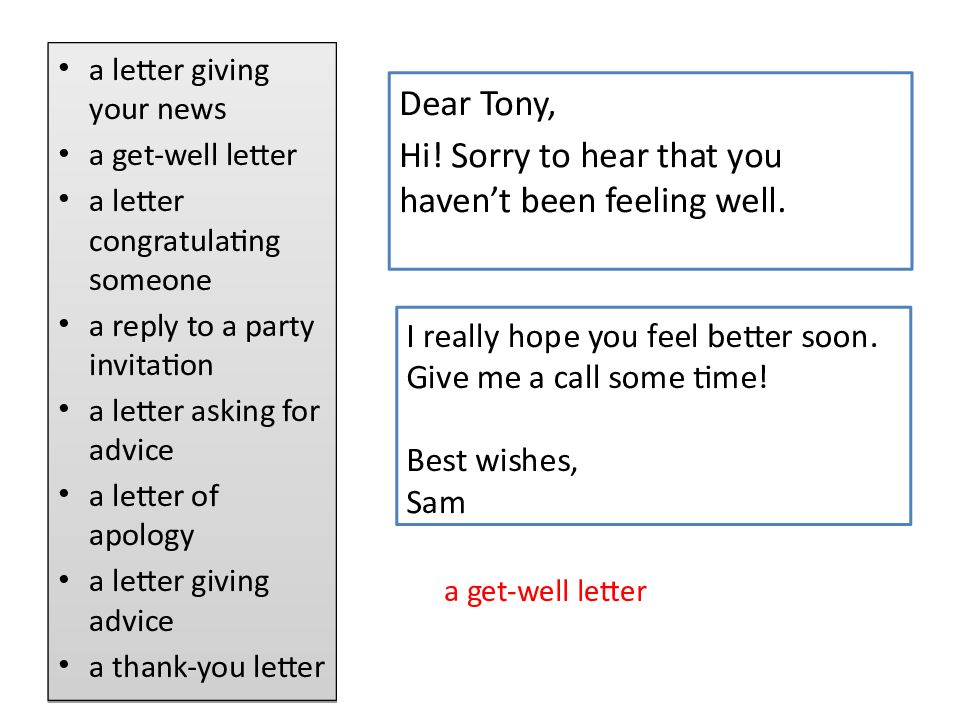 a letter giving your news a get-well letter a letter congratulating someone a reply to a party invitation a letter asking for advice a letter of apology a letter giving advice a thank-you letter Dear Tony, H i! Sorry to hear that you haven’t been feeling well. I really hope you feel better soon. Give me a call some time! Best wishes, Sam a get-well letter