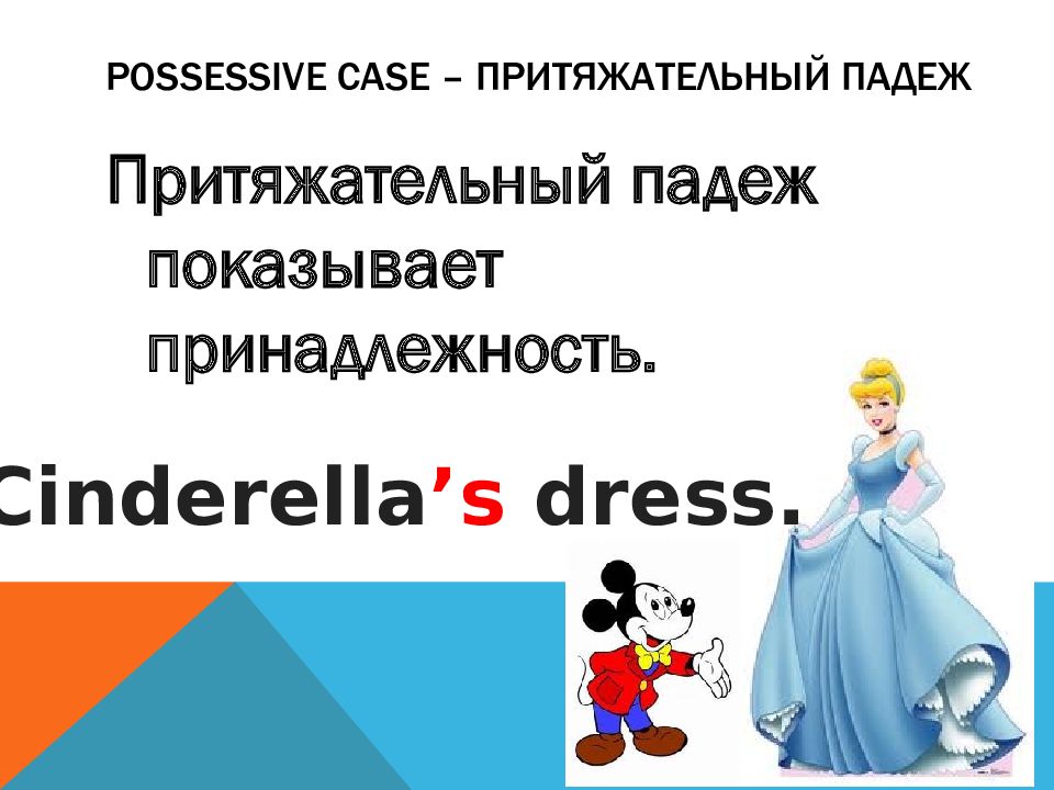 Притяжательный падеж показывает принадлежность. Cinderella ’s dress.
