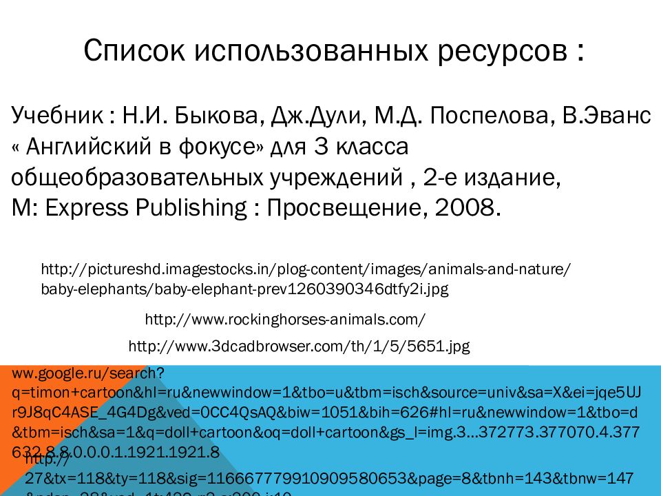 http://www.3dcadbrowser.com/th/1/5/5651.jpg http://www.rockinghorses-animals.com/ http://pictureshd.imagestocks.in/plog-content/images/animals-and-nature/baby-elephants/baby-elephant-prev1260390346dtfy2i.jpg Учебник : Н.И. Быкова, Дж.Дули, М.Д. Поспелова, В.Эванс « Английский в фокусе» для 3 класса общеобразовательных учреждений, 2-е издание, M: Express Publishing : Просвещение, 2008. Список использованных ресурсов : http ://27&tx=118&ty=118&sig=116667779910909580653&page=8&tbnh=143&tbnw=147&ndsp=28&ved=1t:429,r:2,s:200,i:10 ww.google.ru/ search?q = timon+cartoon&hl = ru&newwindow =1&tbo= u&tbm = isch&source = univ&sa = X&ei =jqe5UJr9J8qC4ASE_4G4Dg&ved=0CC4QsAQ&biw=1051&bih=626#hl= ru&newwindow =1&tbo= d&tbm = isch&sa =1&q= doll+cartoon&oq = doll+cartoon&gs_l =img.3...372773.377070.4.377632.8.8.0.0.0.1.1921.1921.8
