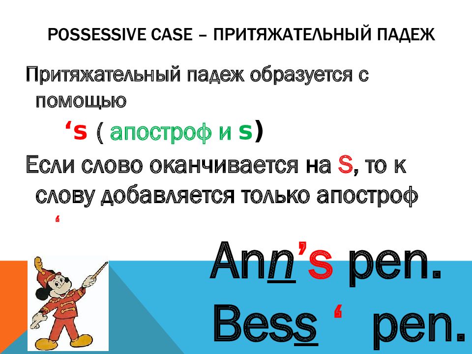 Притяжательный падеж образуется с помощью ‘s ( апостроф и s ) Если слово оканчивается на S, то к слову добавляется только апостроф ‘ An n ’s pen. Bes s ‘ pen.