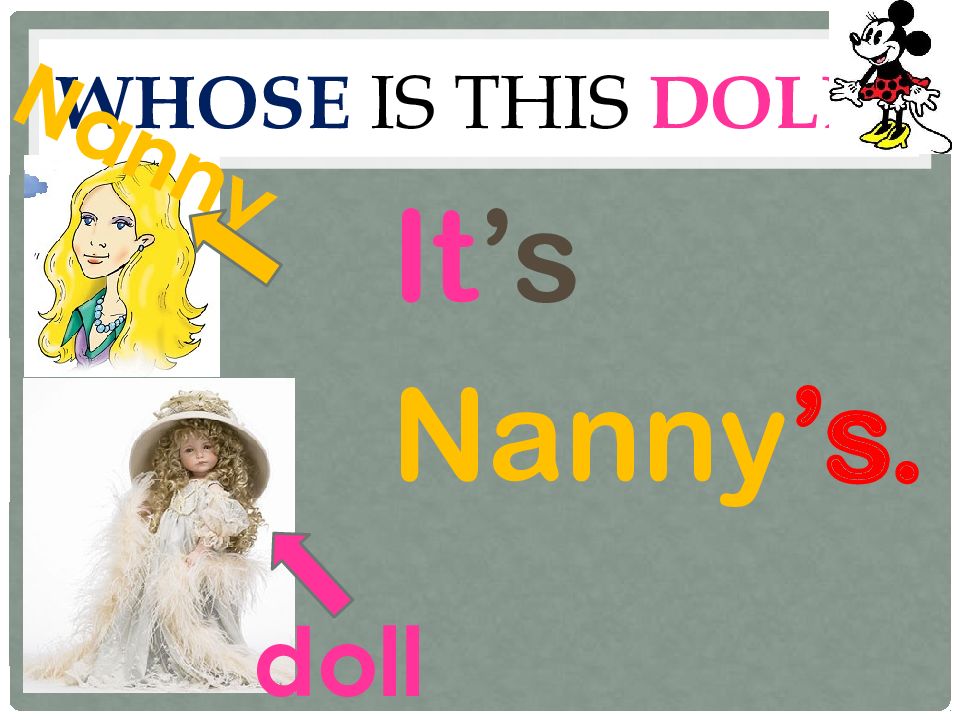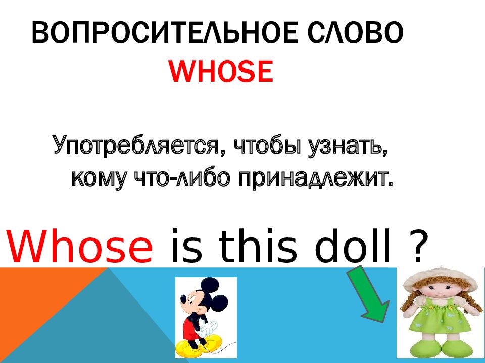 Употребляется, чтобы узнать, кому что-либо принадлежит. Whose is this doll ?