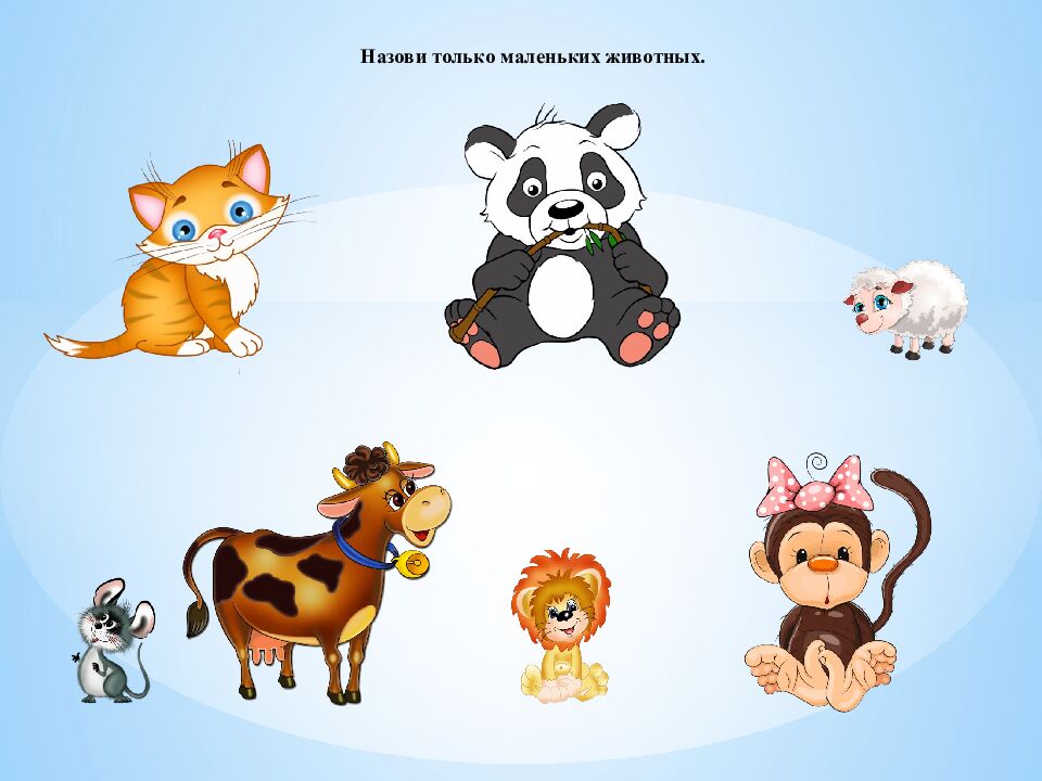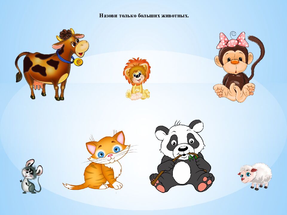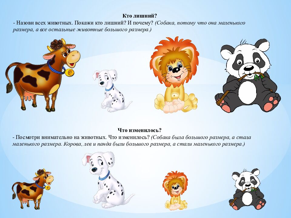 Кто лишний? - Назови всех животных. Покажи кто лишний? И почему? (Собака, потому что она маленького размера, а все остальные животные большого размера.) Что изменилось? - Посмотри внимательно на животных. Что изменилось? (Собака была большого размера, а стала маленького размера. Корова, лев и панда были большого размера, а стали маленького размера.)