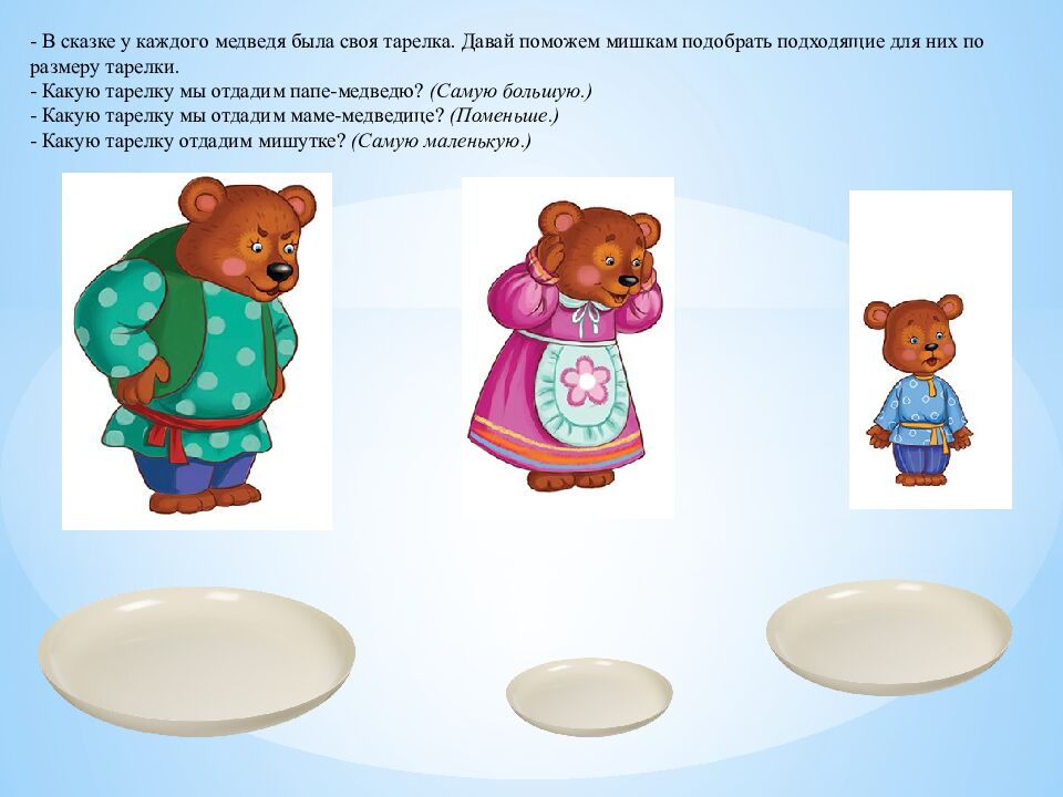 - В сказке у каждого медведя была своя тарелка. Давай поможем мишкам подобрать подходящие для них по размеру тарелки. - Какую тарелку мы отдадим папе-медведю? (Самую большую.) - Какую тарелку мы отдадим маме-медведице? (Поменьше.) - Какую тарелку отдадим мишутке? (Самую маленькую.)