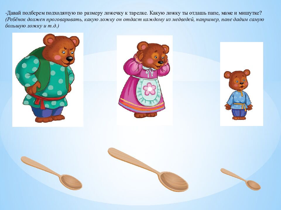 -Давай подберем подходящую по размеру ложечку к тарелке. Какую ложку ты отдашь папе, маме и мишутке? (Ребёнок должен проговаривать, какую ложку он отдаст каждому из медведей, например, папе дадим самую большую ложку и т.д.)