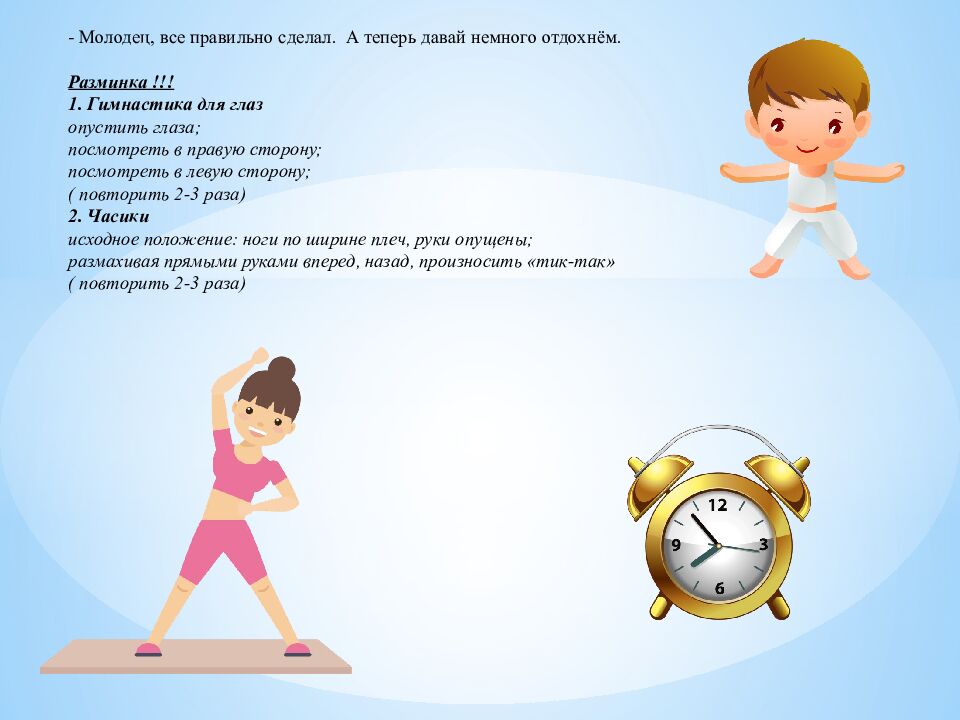 - Молодец, все правильно сделал. А теперь давай немного отдохнём. Разминка !!! 1. Гимнастика для глаз опустить глаза; посмотреть в правую сторону; посмотреть в левую сторону; ( повторить 2-3 раза) 2. Часики исходное положение: ноги по ширине плеч, руки опущены; размахивая прямыми руками вперед, назад, произносить «тик-так» ( повторить 2-3 раза)