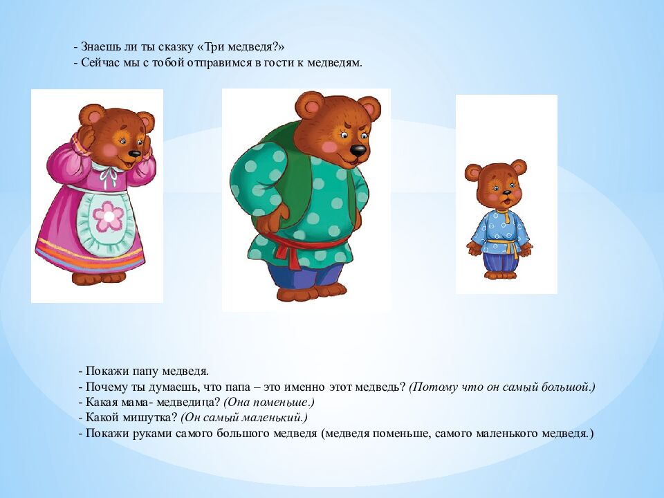 - Знаешь ли ты сказку «Три медведя?» - Сейчас мы с тобой отправимся в гости к медведям. - Покажи папу медведя. - Почему ты думаешь, что папа – это именно этот медведь? (Потому что он самый большой.) - Какая мама- медведица? (Она поменьше.) - Какой мишутка? (Он самый маленький.) - Покажи руками самого большого медведя (медведя поменьше, самого маленького медведя.)