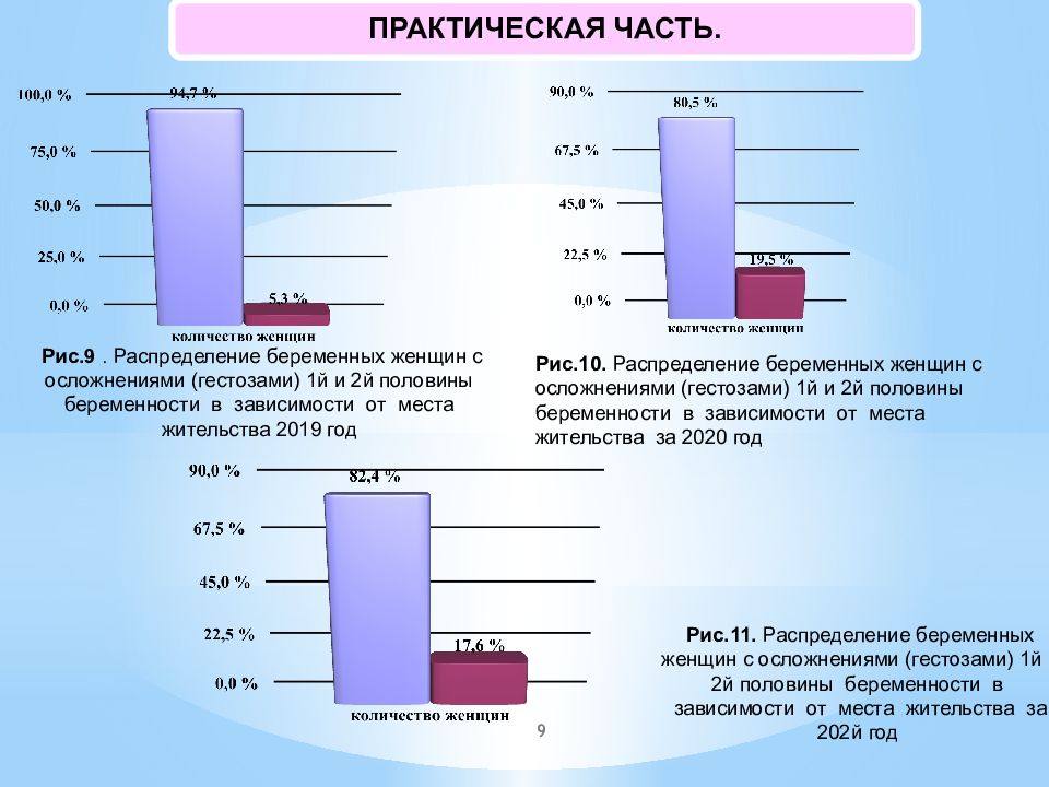 9 ПРАКТИЧЕСКАЯ ЧАСТЬ. Рис.9. Распределение беременных женщин с осложнениями ( гестозами ) 1й и 2й половины беременности в зависимости от места жительства 2019 год Рис.10. Распределение беременных женщин с осложнениями ( гестозами ) 1й и 2й половины беременности в зависимости от места жительства за 2020 год Рис.11. Распределение беременных женщин с осложнениями ( гестозами ) 1й и 2й половины беременности в зависимости от места жительства за 202й год