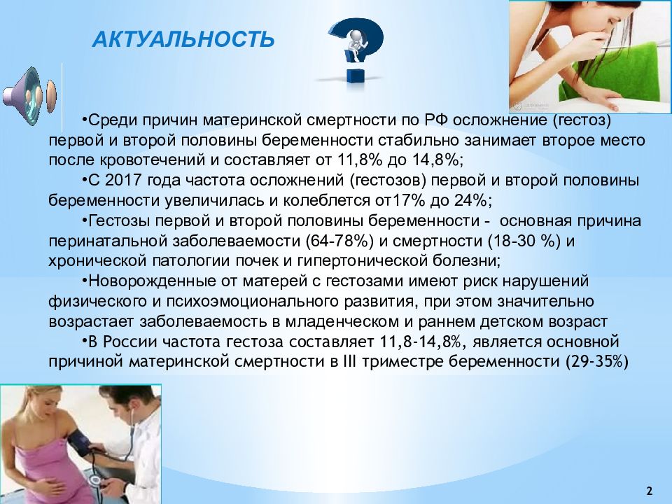 А КТУАЛЬНОСТЬ 2 Среди причин материнской смертности по РФ осложнение ( гестоз ) первой и второй половины беременности стабильно занимает второе место после кровотечений и составляет от 11,8% до 14,8%; С 2017 года частота осложнений ( гестозов ) первой и второй половины беременности увеличилась и колеблется от17% до 24%; Гестозы первой и второй половины беременности - основная причина перинатальной заболеваемости (64-78%) и смертности (18-30 %) и хронической патологии почек и гипертонической болезни; Новорожденные от матерей с гестозами имеют риск нарушений физического и психоэмоционального развития, при этом значительно возрастает заболеваемость в младенческом и раннем детском возраст В России частота гестоза составляет 11,8-14,8%, является основной причиной материнской смертности в III триместре беременности (29-35%)