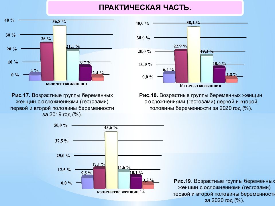 12 ПРАКТИЧЕСКАЯ ЧАСТЬ. Рис.17. Возрастные группы беременных женщин с осложнениями ( гестозами ) первой и второй половины беременности за 2019 год (%). Рис.18. Возрастные группы беременных женщин с осложнениями ( гестозами ) первой и второй половины беременности за 2020 год (%). Рис.19. Возрастные группы беременных женщин с осложнениями ( гестозами ) первой и второй половины беременности за 2020 год (%).