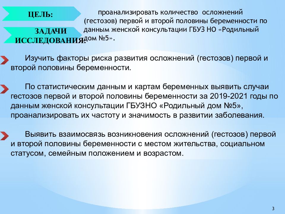 проанализировать количество осложнений ( гестозов ) первой и второй половины беременности по данным женской консультации ГБУЗ НО «Родильный дом №5». ЦЕЛЬ: ЗАДАЧИ ИССЛЕДОВАНИЯ: Изучить факторы риска развития осложнений ( гестозов ) первой и второй половины беременности. По статистическим данным и картам беременных выявить случаи гестозов первой и второй половины беременности за 2019-2021 годы по данным женской консультации ГБУЗНО «Родильный дом №5», проанализировать их частоту и значимость в развитии заболевания. Выявить взаимосвязь возникновения осложнений ( гестозов ) первой и второй половины беременности с местом жительства, социальном статусом, семейным положением и возрастом. 3