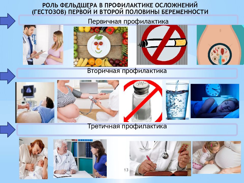 13 Первичная профилактика Третичная профилактика Вторичная профилактика РОЛЬ ФЕЛЬДШЕРА В ПРОФИЛАКТИКЕ ОСЛОЖНЕНИЙ (ГЕСТОЗОВ) ПЕРВОЙ И ВТОРОЙ ПОЛОВИНЫ БЕРЕМЕННОСТИ