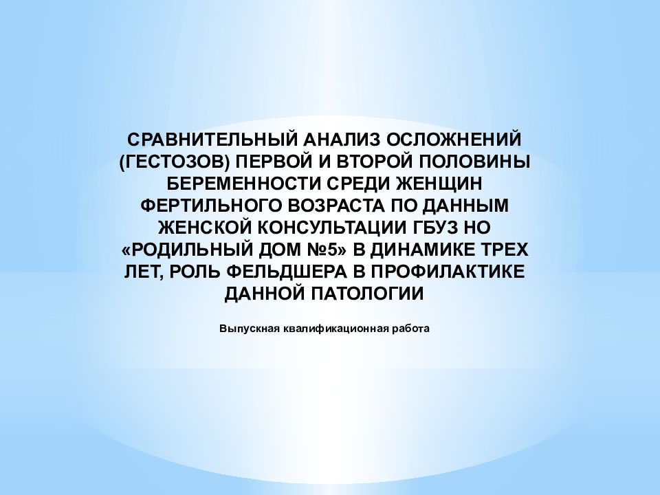 СРАВНИТЕЛЬНЫЙ АНАЛИЗ ОСЛОЖНЕНИЙ (ГЕСТОЗОВ) ПЕРВОЙ И ВТОРОЙ ПОЛОВИНЫ БЕРЕМЕННОСТИ СРЕДИ ЖЕНЩИН ФЕРТИЛЬНОГО ВОЗРАСТА ПО ДАННЫМ ЖЕНСКОЙ КОНСУЛЬТАЦИИ ГБУЗ НО «РОДИЛЬНЫЙ ДОМ №5» В ДИНАМИКЕ ТРЕХ ЛЕТ, РОЛЬ ФЕЛЬДШЕРА В ПРОФИЛАКТИКЕ ДАННОЙ ПАТОЛОГИИ Выпускная квалификационная работа