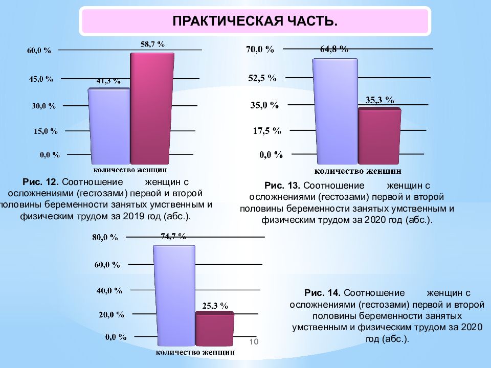 10 ПРАКТИЧЕСКАЯ ЧАСТЬ. Рис. 12. Соотношение женщин с осложнениями ( гестозами ) первой и второй половины беременности занятых умственным и физическим трудом за 2019 год ( абс.). Рис. 13. Соотношение женщин с осложнениями ( гестозами ) первой и второй половины беременности занятых умственным и физическим трудом за 2020 год ( абс.). Рис. 14. Соотношение женщин с осложнениями ( гестозами ) первой и второй половины беременности занятых умственным и физическим трудом за 2020 год ( абс.).