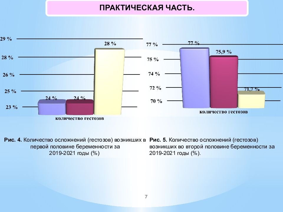 7 ПРАКТИЧЕСКАЯ ЧАСТЬ. Рис. 4. Количество осложнений ( гестозов ) возникших в первой половине беременности за 2019-2021 годы (%) Рис. 5. Количество осложнений ( гестозов ) возникших во второй половине беременности за 2019-2021 годы (%).