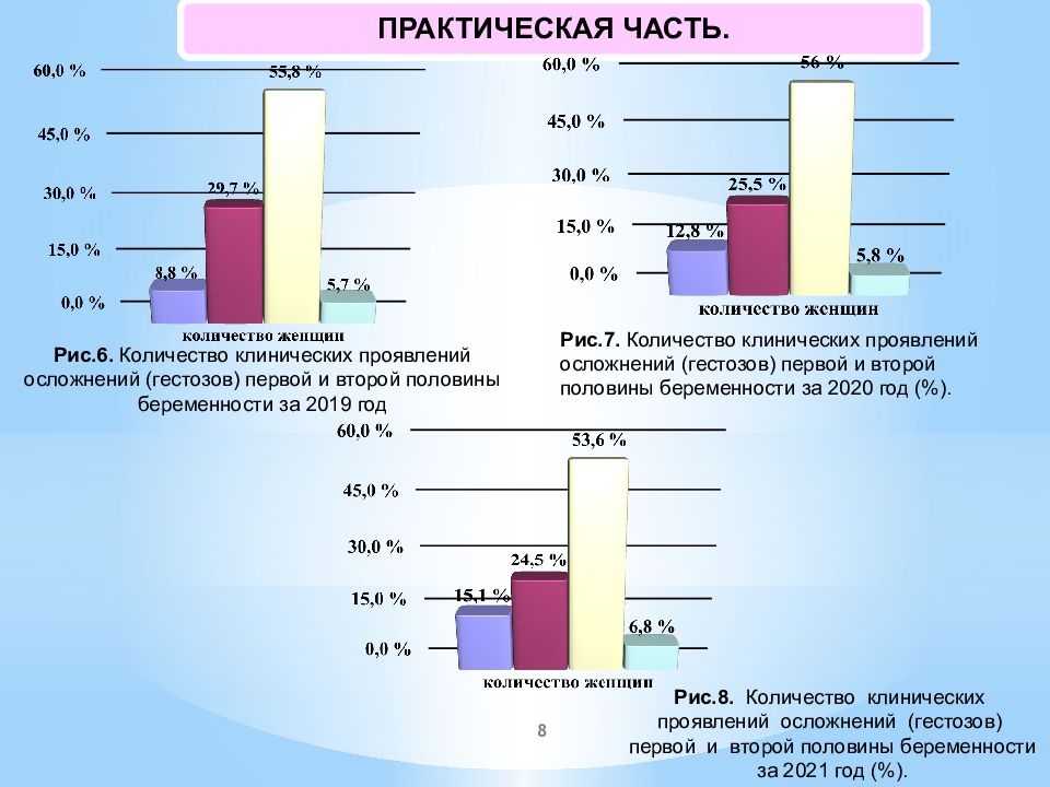 8 ПРАКТИЧЕСКАЯ ЧАСТЬ. Рис.6. Количество клинических проявлений осложнений ( гестозов ) первой и второй половины беременности за 2019 год Рис.7. Количество клинических проявлений осложнений ( гестозов ) первой и второй половины беременности за 2020 год (%). Рис.8. Количество клинических проявлений осложнений ( гестозов ) первой и второй половины беременности за 2021 год (%).