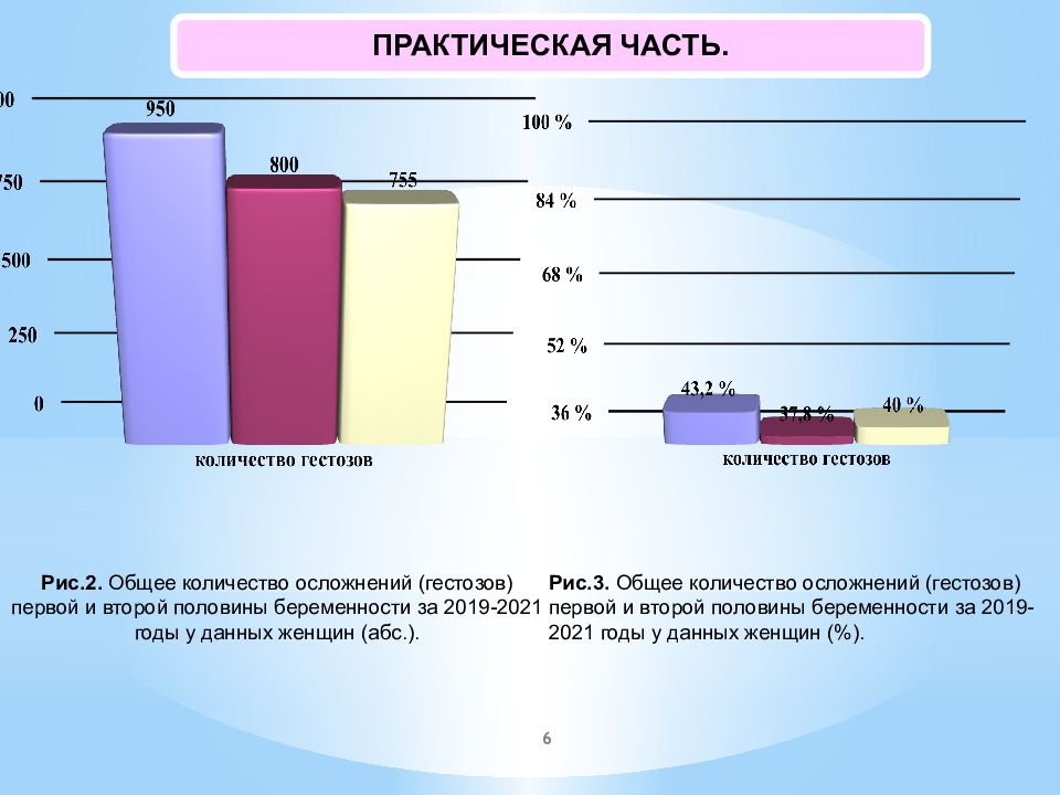 6 ПРАКТИЧЕСКАЯ ЧАСТЬ. Рис.2. Общее количество осложнений ( гестозов ) первой и второй половины беременности за 2019-2021 годы у данных женщин ( абс.). Рис.3. Общее количество осложнений ( гестозов ) первой и второй половины беременности за 2019-2021 годы у данных женщин (%).