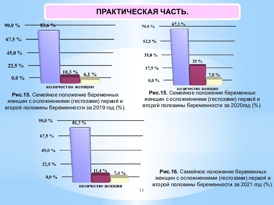 11 ПРАКТИЧЕСКАЯ ЧАСТЬ. Рис.15. Семейное положение беременных женщин с осложнениями ( гестозами ) первой и второй половины беременности за 2019 год (%). Рис.15. Семейное положение беременных женщин с осложнениями ( гестозами ) первой и второй половины беременности за 2020год (%). Рис.16. Семейное положение беременных женщин с осложнениями ( гестозами ) первой и второй половины беременности за 2021 год (%).