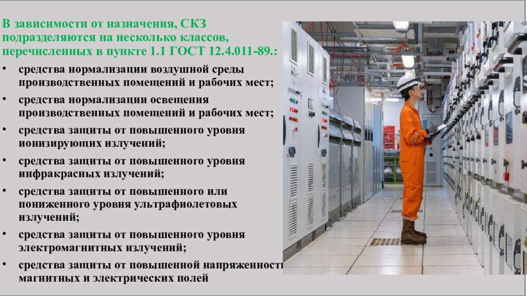 В зависимости от назначения, СКЗ подразделяются на несколько классов, перечисленных в пункте 1.1 ГОСТ 12.4.011-89.: средства нормализации воздушной среды производственных помещений и рабочих мест; средства нормализации освещения производственных помещений и рабочих мест; средства защиты от повышенного уровня ионизирующих излучений; средства защиты от повышенного уровня инфракрасных излучений; средства защиты от повышенного или пониженного уровня ультрафиолетовых излучений; средства защиты от повышенного уровня электромагнитных излучений; средства защиты от повышенной напряженности магнитных и электрических полей