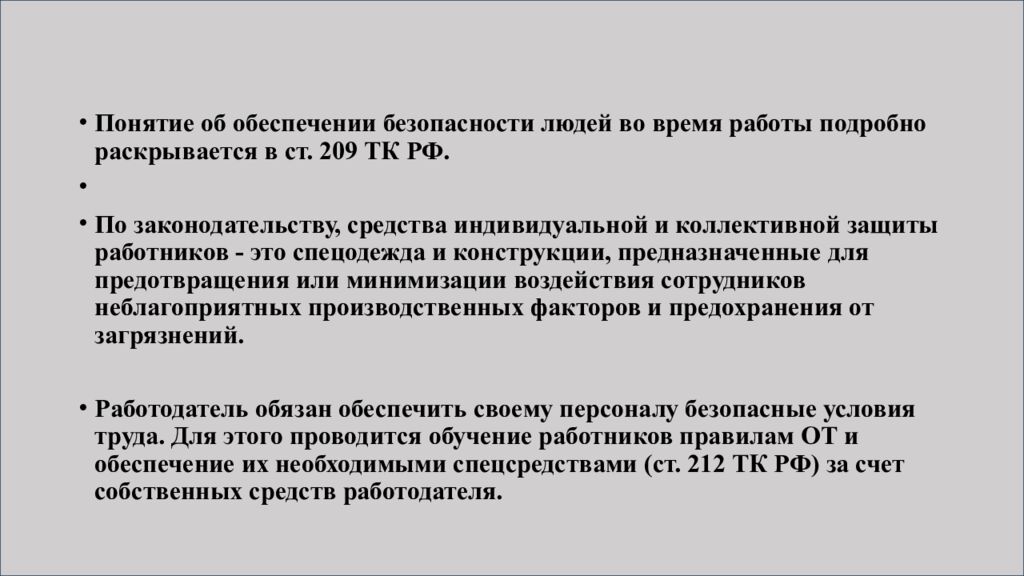 Понятие об обеспечении безопасности людей во время работы подробно раскрывается в ст. 209 ТК РФ. По законодательству, средства индивидуальной и коллективной защиты работников - это спецодежда и конструкции, предназначенные для предотвращения или минимизации воздействия сотрудников неблагоприятных производственных факторов и предохранения от загрязнений. Работодатель обязан обеспечить своему персоналу безопасные условия труда. Для этого проводится обучение работников правилам ОТ и обеспечение их необходимыми спецсредствами (ст. 212 ТК РФ) за счет собственных средств работодателя.
