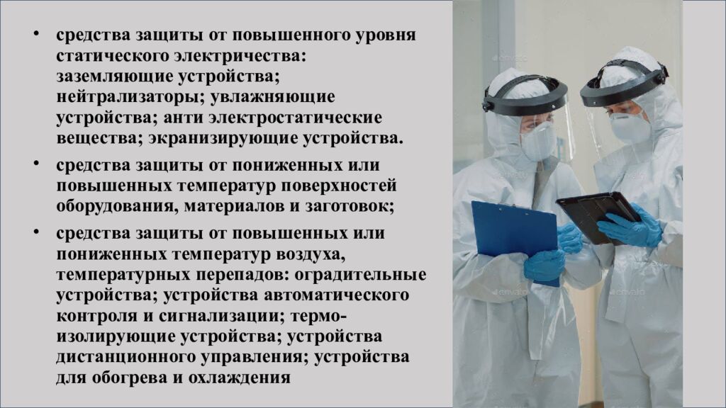 средства защиты от повышенного уровня статического электричества: заземляющие устройства; нейтрализаторы; увлажняющие устройства; анти электростатические вещества; экранизирующие устройства. средства защиты от пониженных или повышенных температур поверхностей оборудования, материалов и заготовок; средства защиты от повышенных или пониженных температур воздуха, температурных перепадов: оградительные устройства; устройства автоматического контроля и сигнализации; термо -изолирующие устройства; устройства дистанционного управления; устройства для обогрева и охлаждения