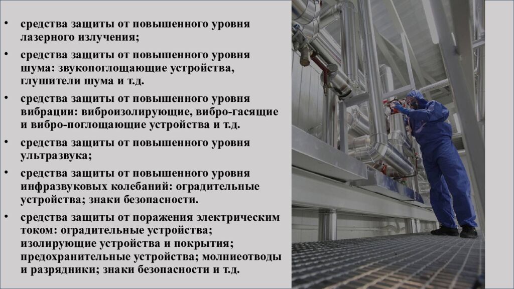 средства защиты от повышенного уровня лазерного излучения; средства защиты от повышенного уровня шума: звукопоглощающие устройства, глушители шума и т.д. средства защиты от повышенного уровня вибрации: виброизолирующие, вибро -гасящие и вибро -поглощающие устройства и т.д. средства защиты от повышенного уровня ультразвука; средства защиты от повышенного уровня инфразвуковых колебаний: оградительные устройства; знаки безопасности. средства защиты от поражения электрическим током: оградительные устройства; изолирующие устройства и покрытия; предохранительные устройства; молниеотводы и разрядники; знаки безопасности и т.д.